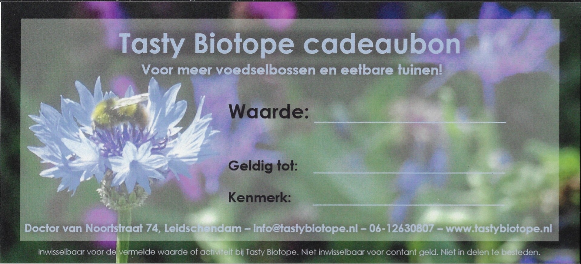 Verkrijgbaar voor ieder gewenst bedrag en inwisselbaar voor alle Tasty Biotope activiteiten.